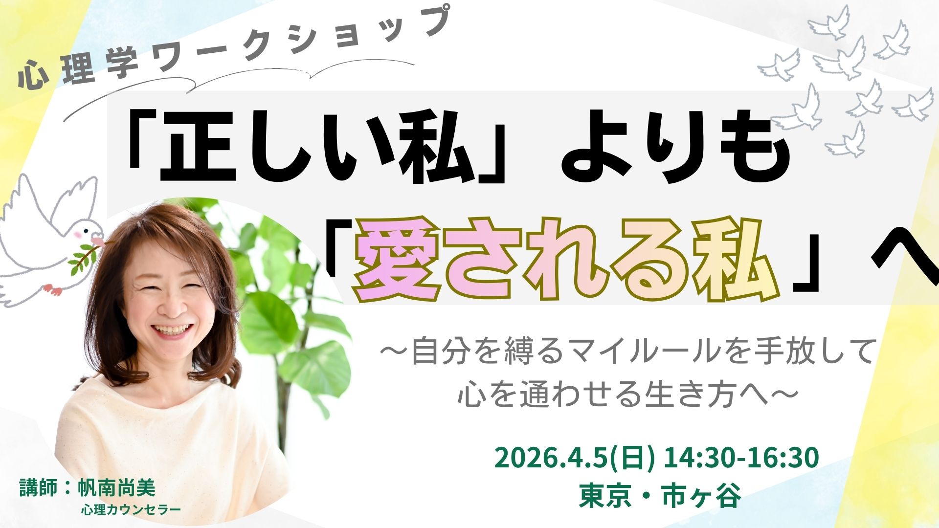 こんにちは、心理カウンセラーの帆南尚美です。 今日は、4月5日(日)に東京で開催する心理学ワークショップの告知をさせていただきます!
